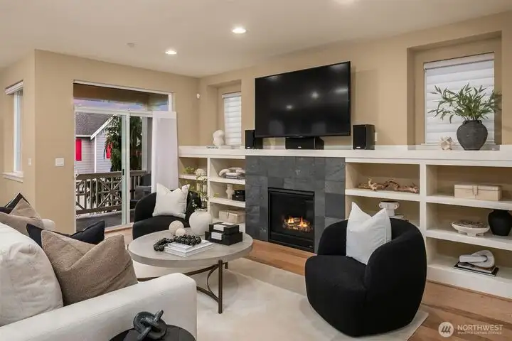 - Great room with built-in shelving and gas fireplace