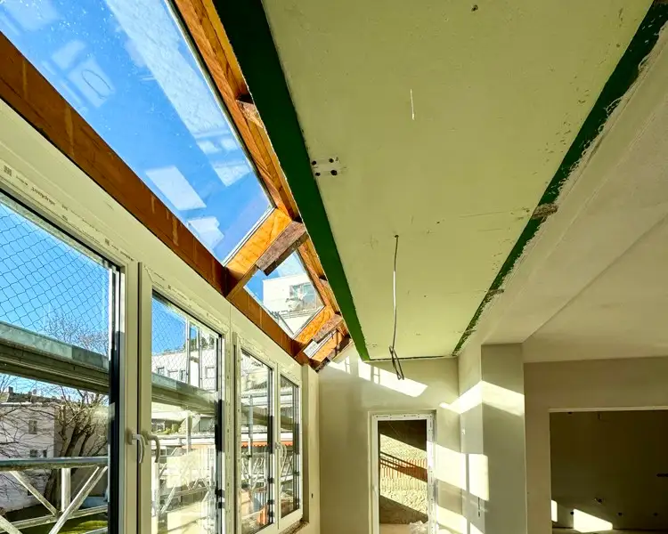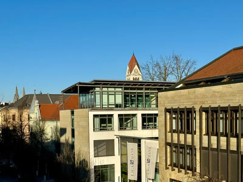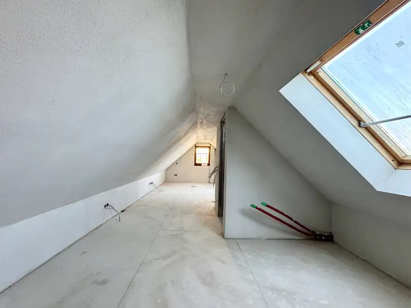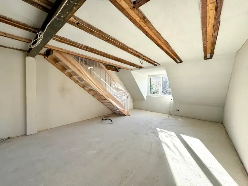 On the second floor is the spacious attic apartment, which has been completely refurbished with large dormer windows, new roof cladding and extensive roof insulation. A large bedroom with floor-to-ceiling windows and a French balcony as well as an open-plan living and dining area provide a pleasant living space. An elegant wooden staircase leads to the spacious attic studio for individual use as a home office, etc. Here there is a beautiful view over the roofscape and a particularly pleasant atmosphere with exposed beams.