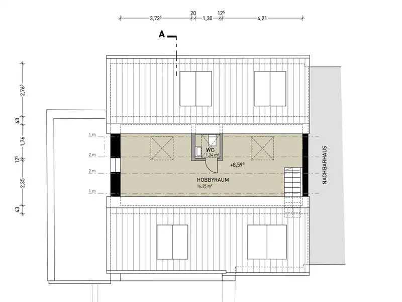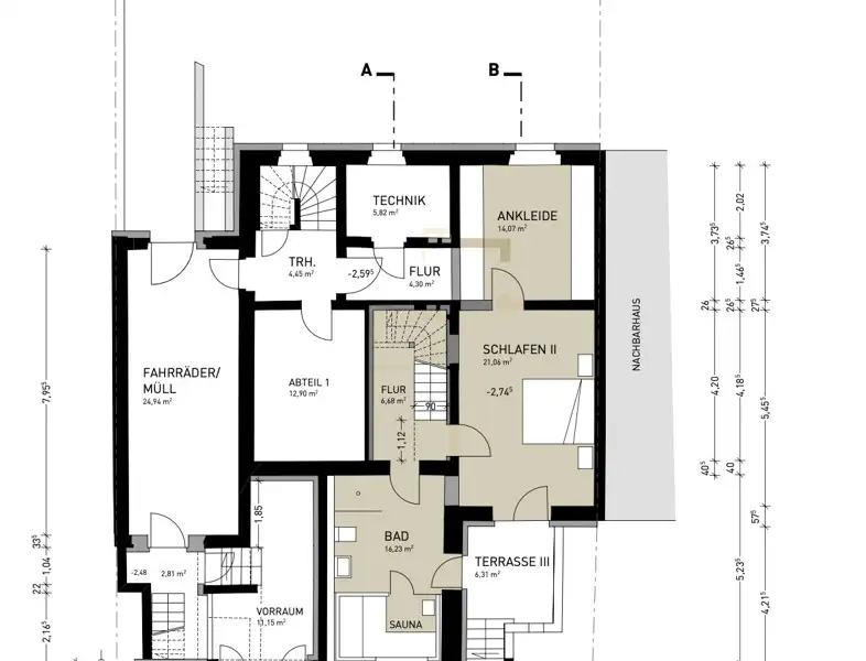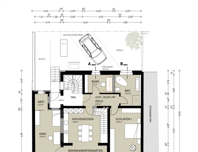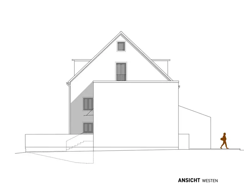 The basement offers the possibility of an individual room layout, allowing the creation of an independent 1.5-room granny apartment with a large bathroom, its own terrace area and garden access. The current plans also include access via the living/dining area on the first floor, allowing the lower living area to be used as a wellness area with sauna or private guest area.