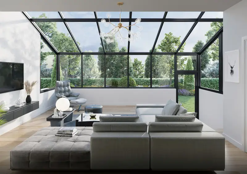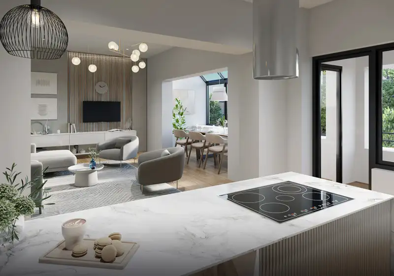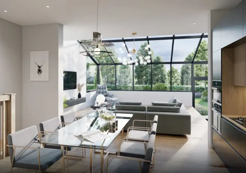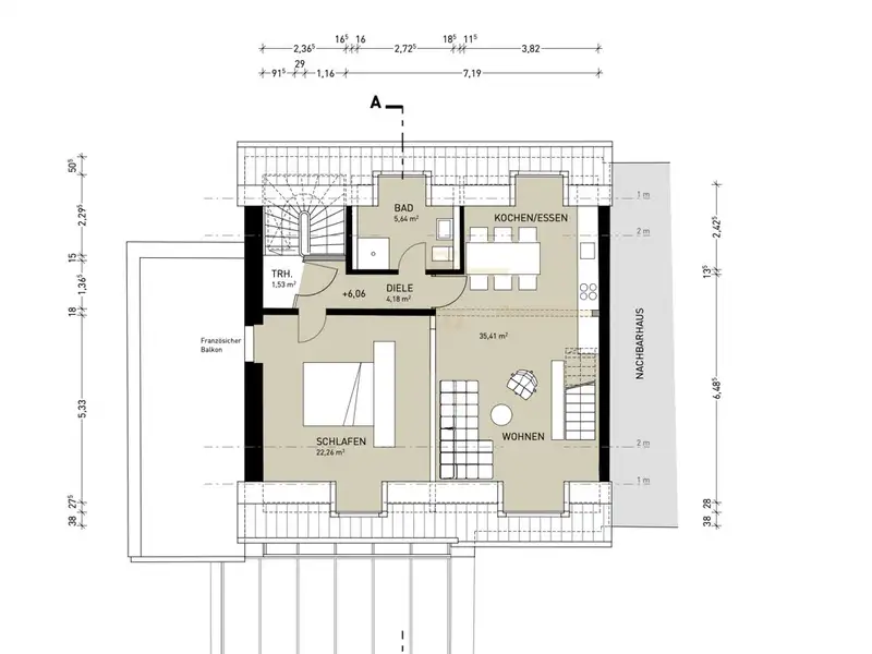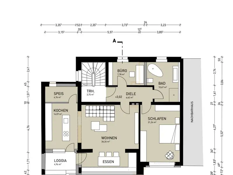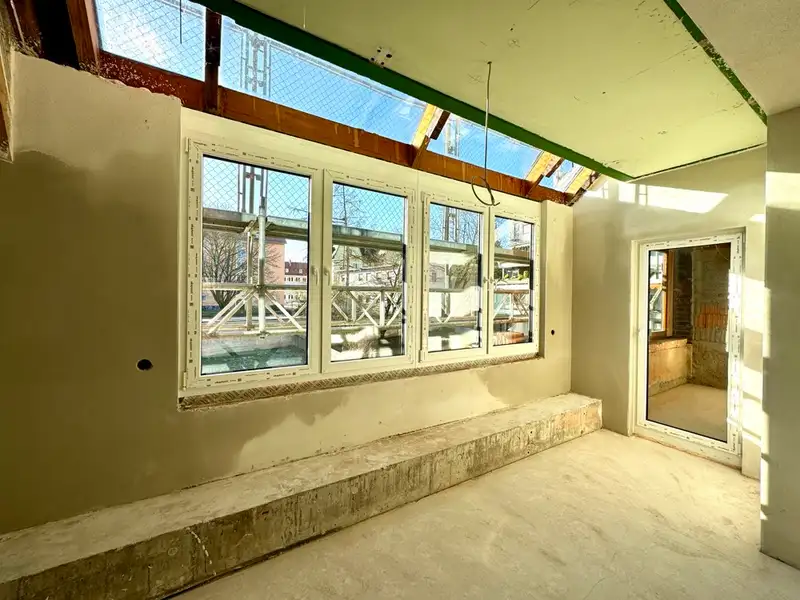 On the second floor, the residential unit can be characterized by its own individual living concept. A very large loggia with a wide-opening window system is available here to extend the living space and enjoy the fantastic view of the garden area. An open kitchen with a cooking island is also integrated into the conservatory.