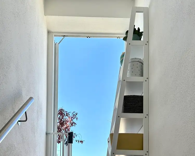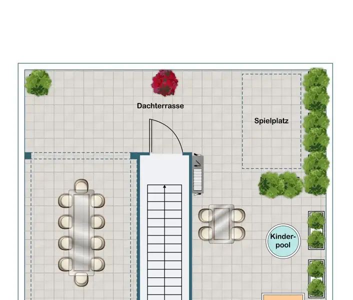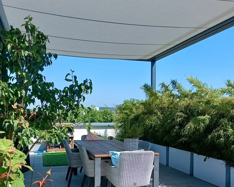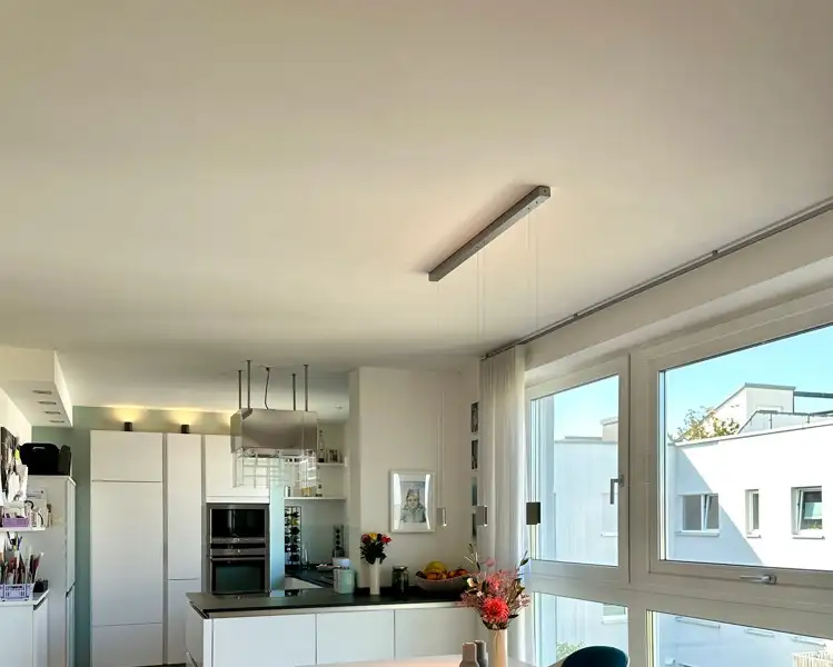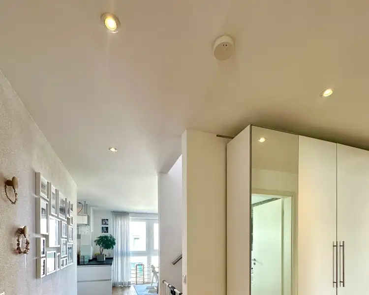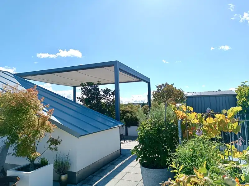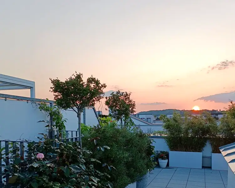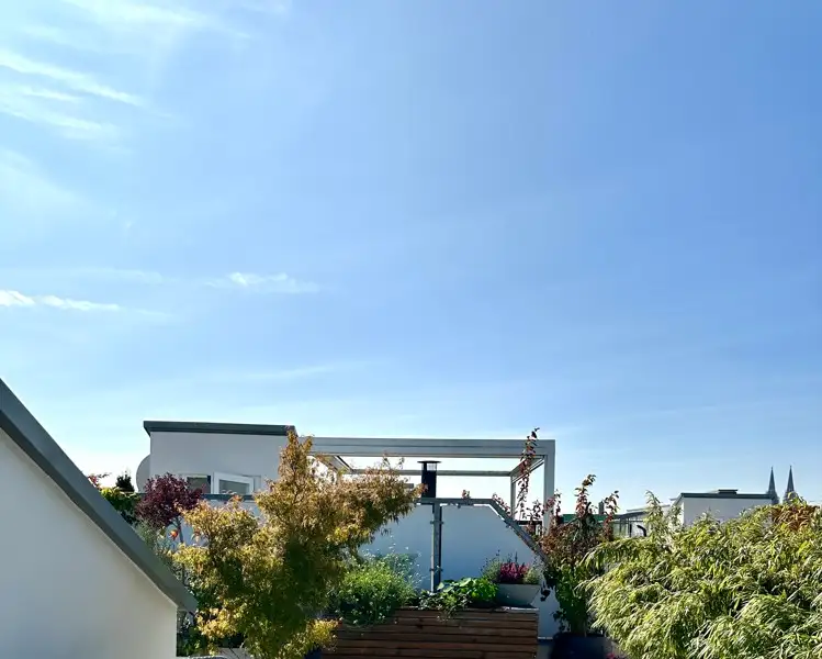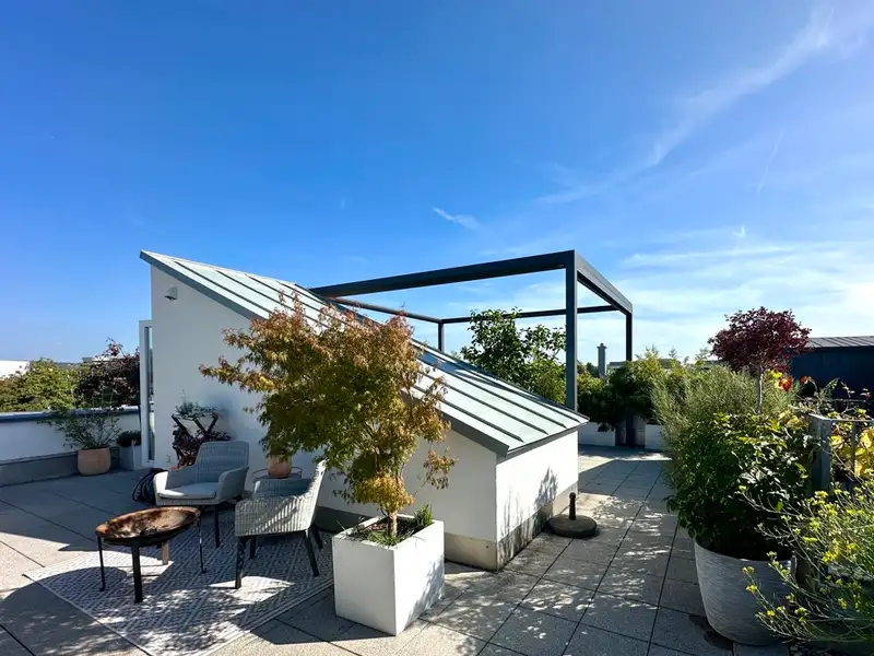 The absolute highlight of this property is undoubtedly the spacious roof terrace with 71 square meters of space, which extends above the apartment. You can reach this oasis of relaxation via an elegant staircase with elegant wooden flooring and dimmable ceiling spotlights, as well as side staircase lighting. From here, you can enjoy a breathtaking panoramic view over the whole of Regensburg and the surrounding area. The roof terrace already has a beautiful stock of plants in numerous plant troughs. A high-quality, electric aluminum shading system provides horizontal and vertical shading with an awning. Here you will find plenty of space for a children's play area, a dining area with a barbecue and even the option of installing a large hot tub - perfect for enjoying the picturesque sunsets in the evening in a pleasant atmosphere.
