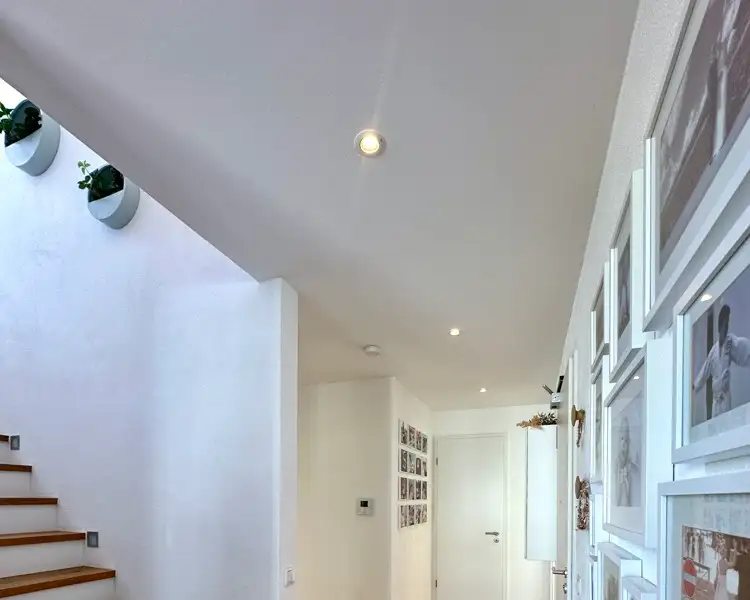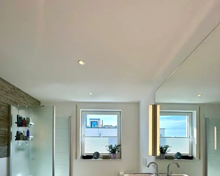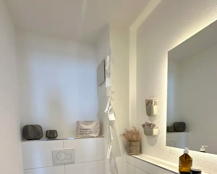 The spacious dining area offers plenty of room for the whole family and provides a wonderful view of the surrounding area through floor-to-ceiling windows. In the spacious living room, you will find enough room for a comfortable sofa and living area. The integrated ceiling downlighting creates a pleasant atmosphere. Another hallway leads you into the spacious bedroom, which has room for a large bed and a closet. The guest WC is a practical addition. The bathroom pampers you with luxurious details, including a large-format, timeless tiled backsplash, a double washbasin with vanity units and high-quality bathroom fittings from the renowned company Heibad and dimmable ceiling spotlights. A spacious bathtub invites you to relax after a long day at work, while the floor-to-ceiling shower offers additional comfort.