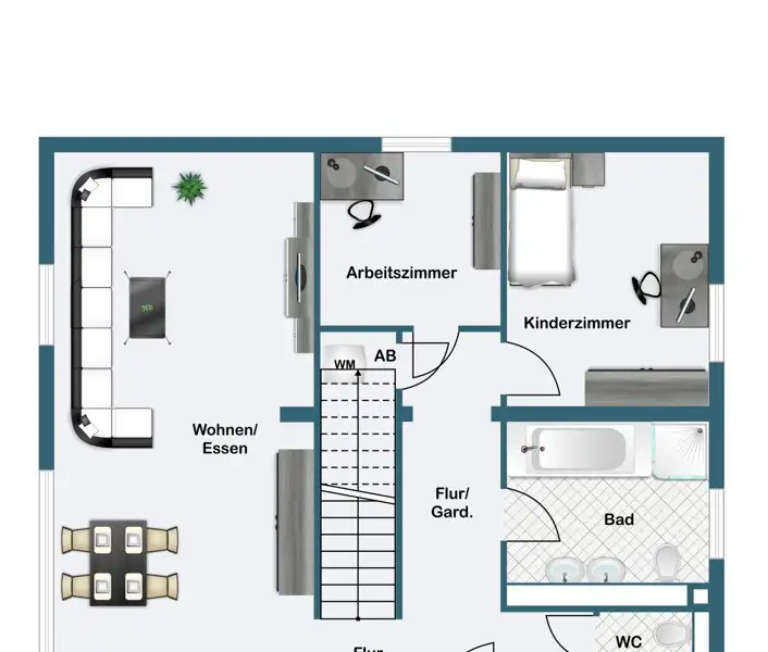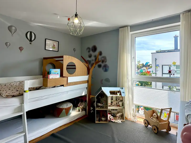 The children's room is generously proportioned and offers a pleasant daylight atmosphere thanks to floor-to-ceiling windows. The study can also be used flexibly as a guest room or dressing room.