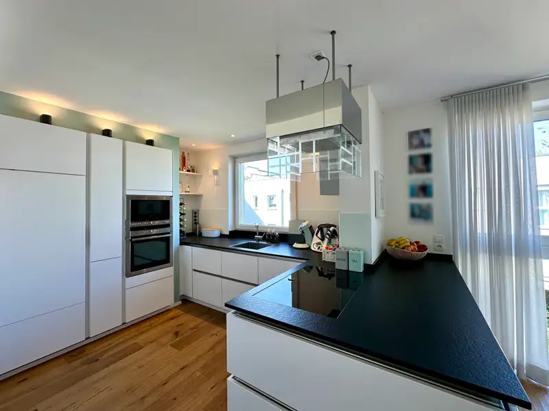 The open plan living and dining area is a highlight of this property and features a spacious, first-class fitted kitchen with counter space. The high-quality Nero Assoluto granite worktop exudes elegance, while all the necessary technical appliances from renowned brands are already integrated, including an induction hob.