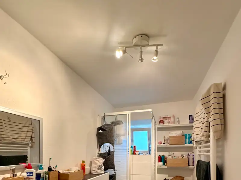 The bedroom is also generously proportioned and offers enough space for a large bed and a closet. The modern bathroom with daylight window is stylishly tiled and has a shower and washbasin - a place to feel good.
