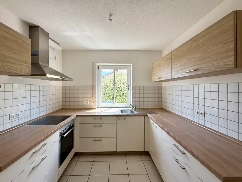 Adjacent is the stylish fitted kitchen, which is already fully equipped - with ceramic hob, oven, stainless steel extractor hood, sink and fridge. The combination of light-colored fronts and warm wooden accents creates a modern, homely atmosphere. Generously proportioned and functionally planned, this room invites amateur chefs to let off steam creatively. A practical sliding door provides a direct transition to the dining area - short distances, great effect.