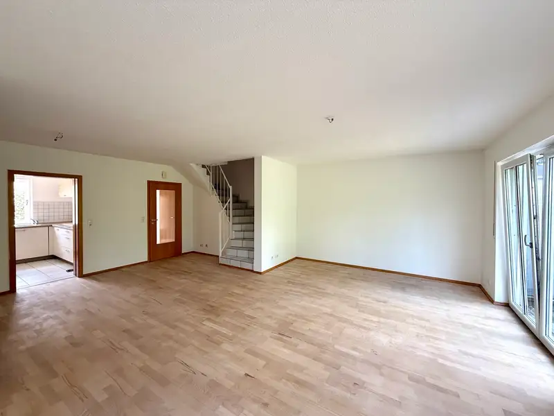 Inside, the light-flooded living and dining area opens up - the heart of the house. The high-quality parquet flooring lends warmth and elegance to the spacious room, while floor-to-ceiling windows provide a view of the idyllic garden. Living, living and relaxing blend harmoniously here: whether it's cozy evenings with the family, dinner with friends or simply quiet moments with a book - this place offers space for everything that makes life beautiful.