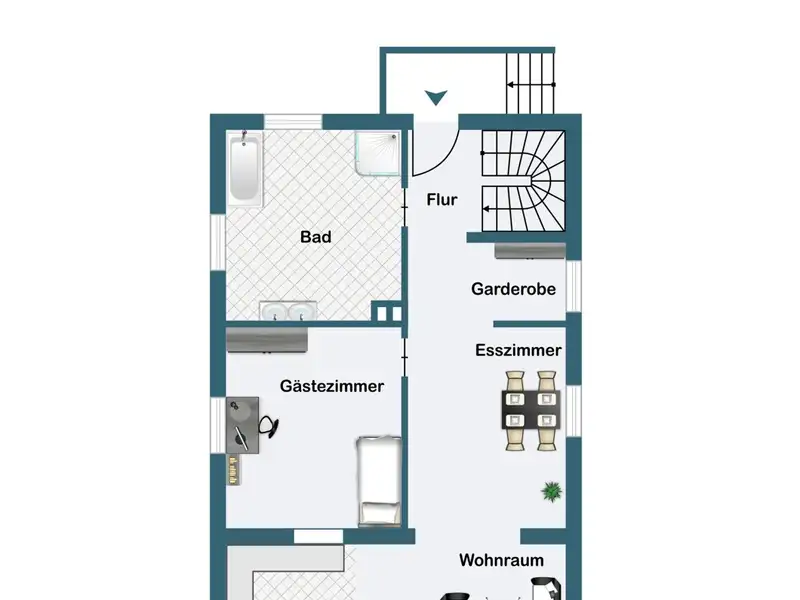 The separate guest room is located in the entrance area on the first floor. This offers a variety of uses, whether for guests, as an office or as an additional room for individual needs.