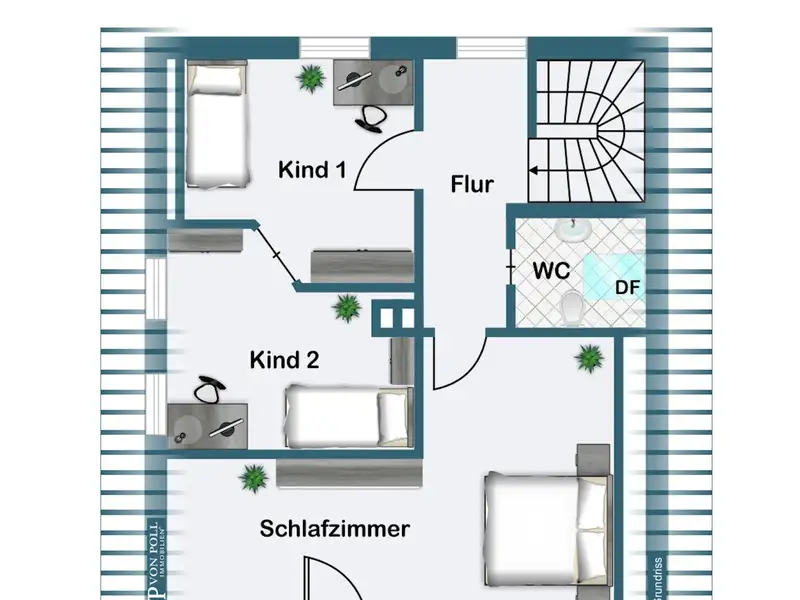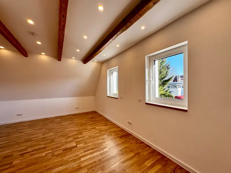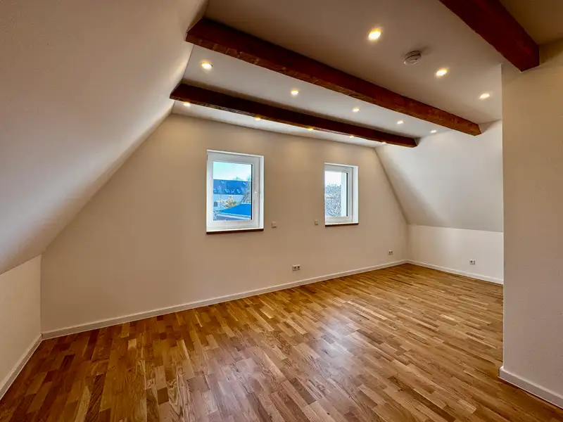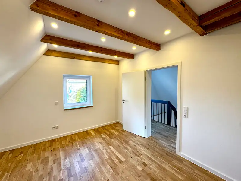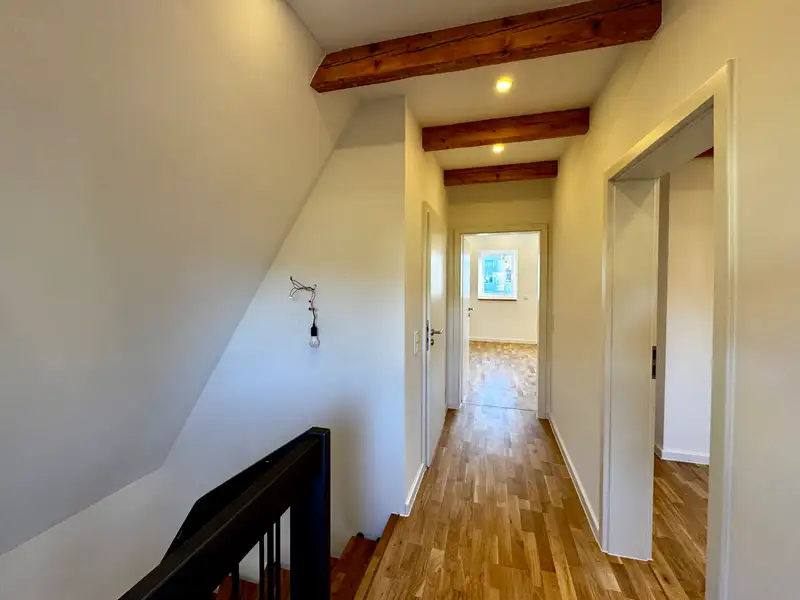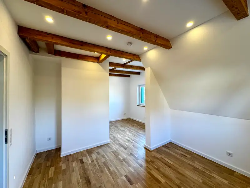 The upper floor offers space and comfort for the whole family. There is a spacious master bedroom and two beautiful children's bedrooms. All rooms are fitted with high-quality real wood parquet flooring and offer a cozy atmosphere. The exposed wooden beams lend the rooms additional charm, while the characteristic mansard roof provides a special coziness.
