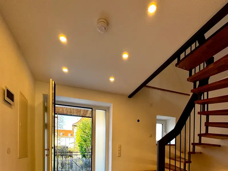 As soon as you enter the house, you will feel the inviting elegance of the spacious entrance area. There is not only enough space for a checkroom here, but also a large checkroom area of its own to keep things tidy and organized. The combination of high-quality floor tiles, a modern downlight system and elegant design elements creates a stylish ambience. The tasteful staircase connects all three levels and is a real eye-catcher.