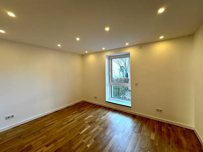 The open-plan living and dining area forms the heart of the house. Large, floor-to-ceiling patio doors flood the room with natural light, offer a fantastic view of the expansive garden and provide direct access to the spacious terrace - a perfect place to spend relaxing hours outdoors. The high-quality real wood parquet flooring creates a warm and inviting atmosphere.