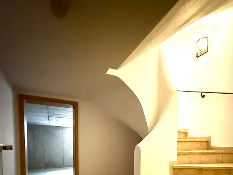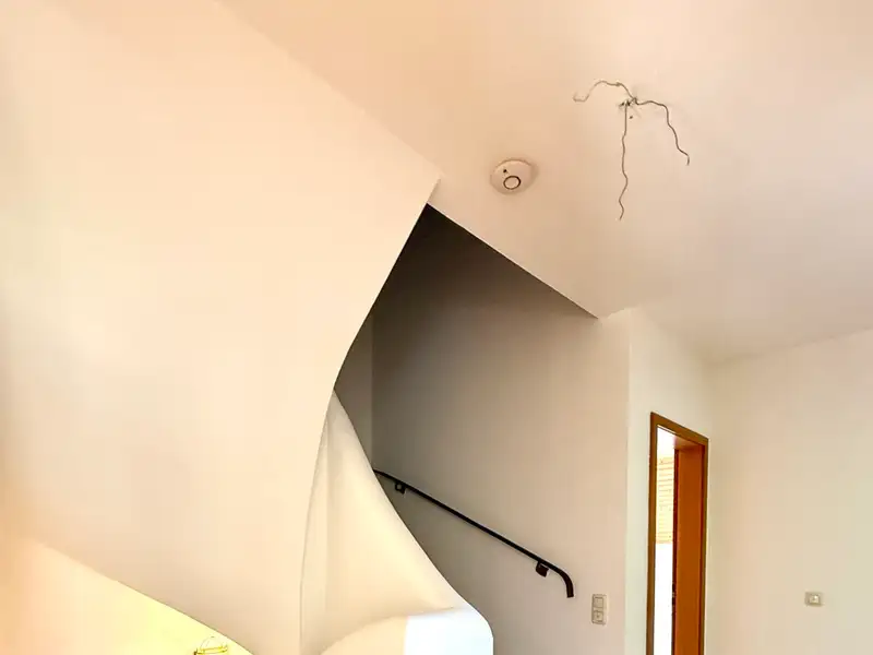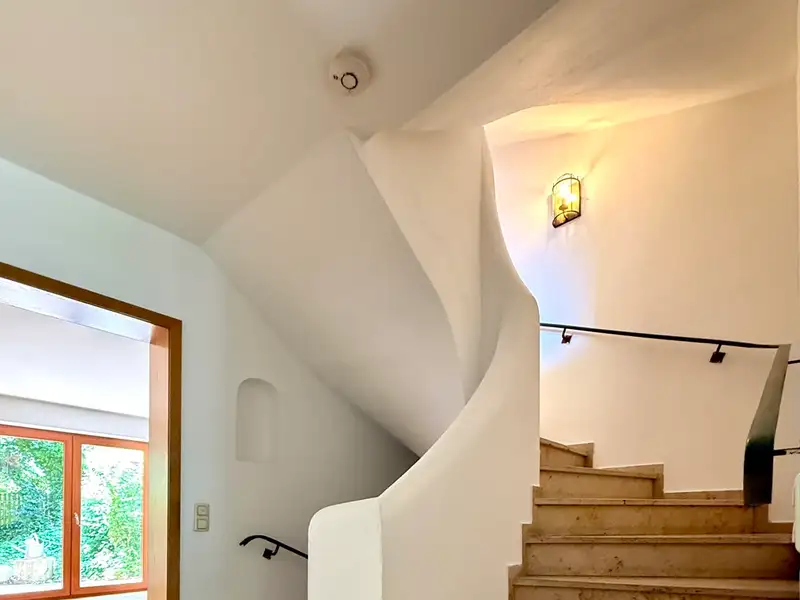 An organically shaped staircase connects all floors. Three cozy bedrooms, all flooded with natural light, await you on the upper floor. Two of the rooms are perfect as loving children's rooms - with enough space for a bed, desk, toys and personal retreat corners. Particularly nice: two bedrooms offer direct access to the south-facing balcony - here you can enjoy the light and an unobstructed view of the greenery.