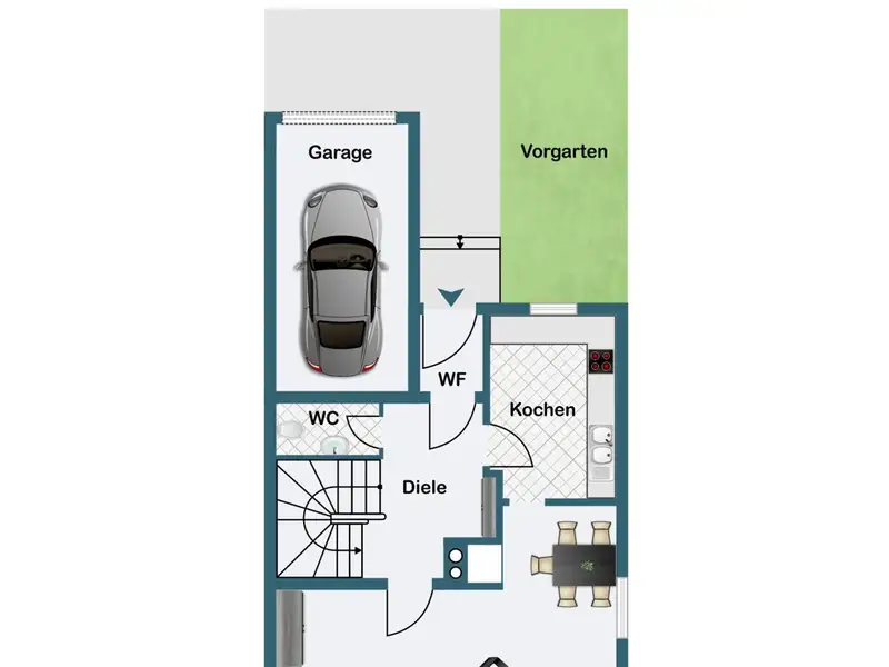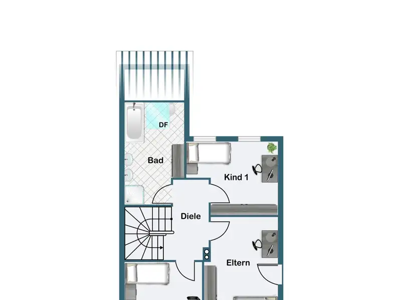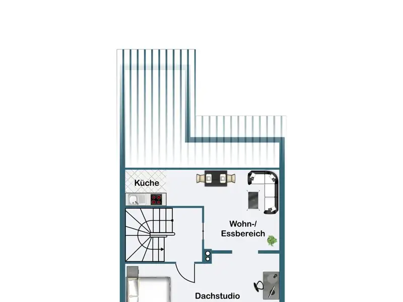 The top floor offers expansion potential and has already been visualized as a studio floor plan: With a living/dining area, a bedroom, work or guest area and a small kitchen, a self-contained unit can be created here - ideal for an older child, a home office or a separate guest level.