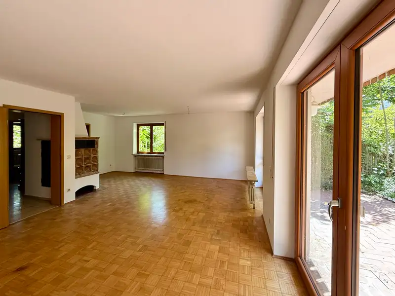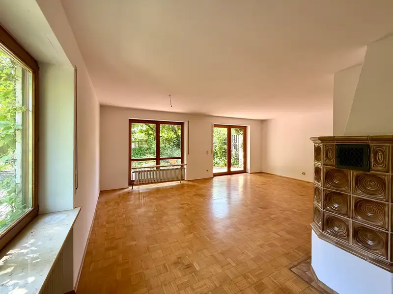 A charming highlight is the brick tiled stove - it provides cozy warmth and a homely atmosphere on cool days. The living area itself offers plenty of space for a large living area, sofa corner or individual furnishings. From here you can access the sunny south-facing terrace and the beautiful garden area - a sheltered retreat with plenty of privacy.