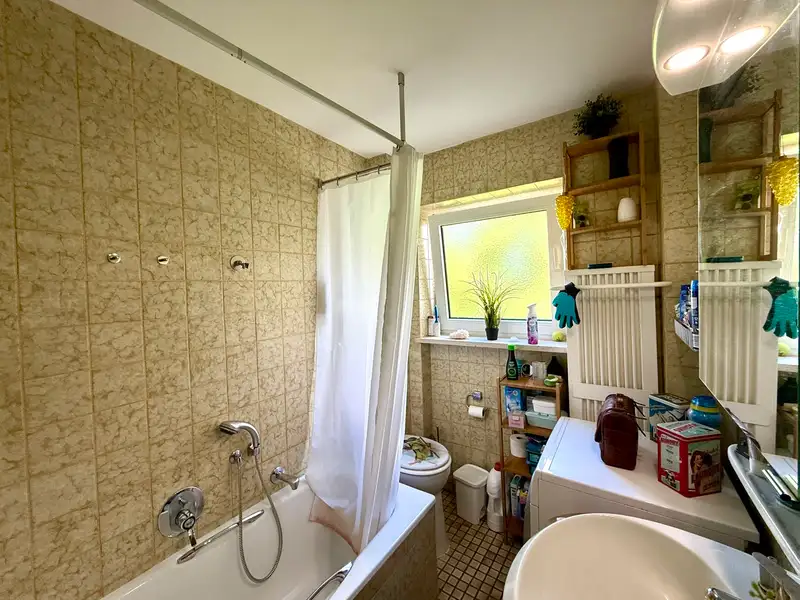 The bathroom also scores with natural light, is classically tiled and equipped with a bathtub and washing machine connection. The combination of natural light and good room layout creates a pleasant, friendly atmosphere.