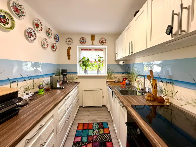 The modern kitchen is kept separate and equipped with all technical appliances - from ceramic hob and oven to dishwasher and fridge-freezer. A large window provides natural light and good ventilation - a rarity in this size of apartment.