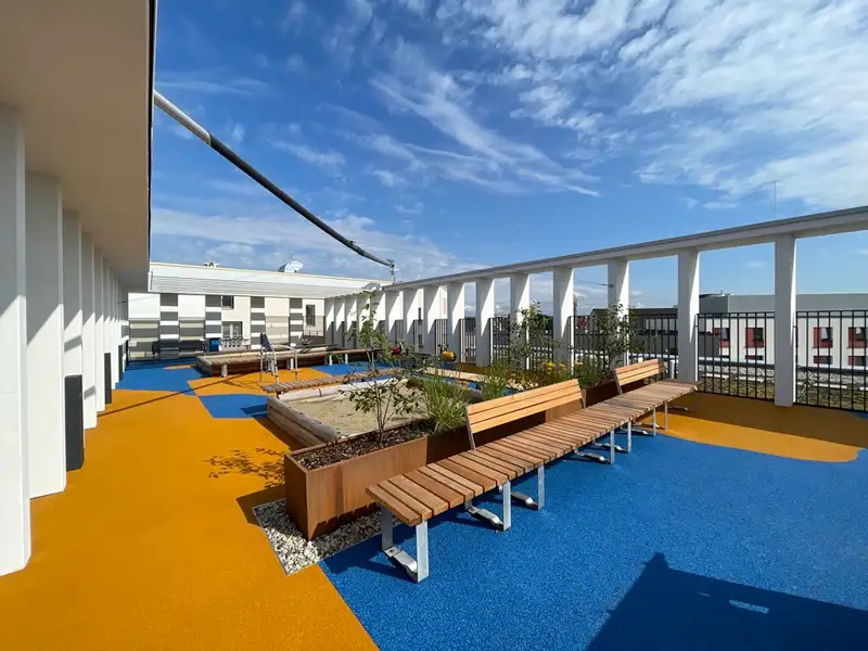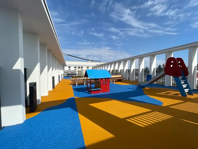- Large communal roof terrace with playground