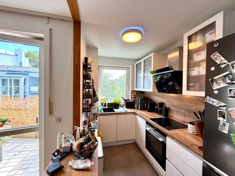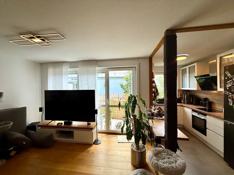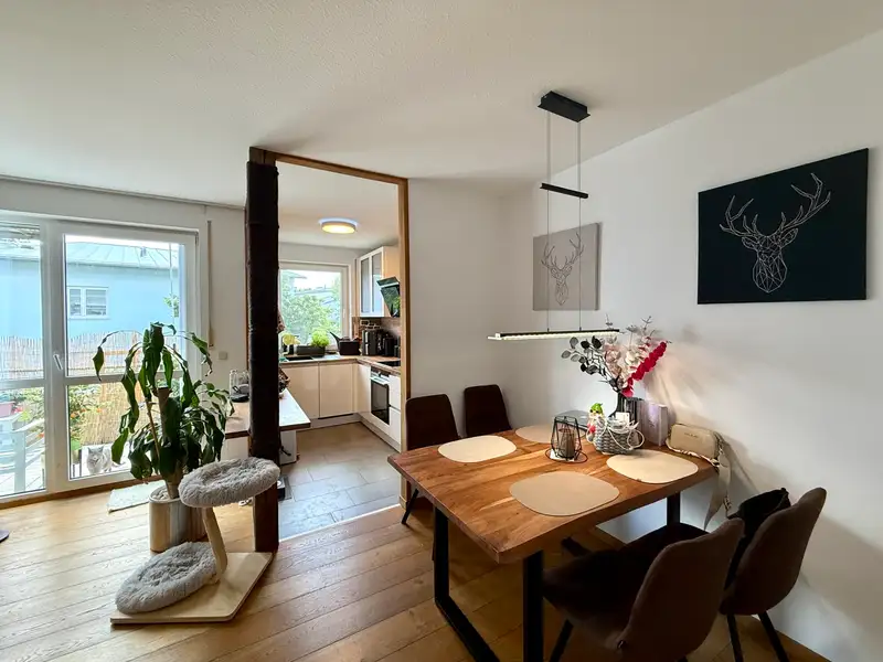 The heart of the apartment is undoubtedly the open-plan living and dining area with direct access to the large, sunny roof terrace. Thanks to its south-facing orientation, you can enjoy sunshine all day long and a fantastic unobstructed view of the green surroundings. Whether breakfast in the open air or a relaxed glass of wine at sunset - this space is a real highlight.