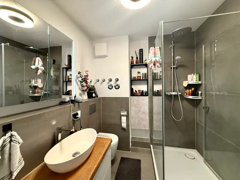 The stylishly modernized bathroom impresses with clean lines, large-format tiles and a high-quality, floor-to-ceiling glass shower - a place to take a deep breath and feel good. The other furnishing details, such as the elegant washbasin and niche shelves, also ensure all-round functionality.