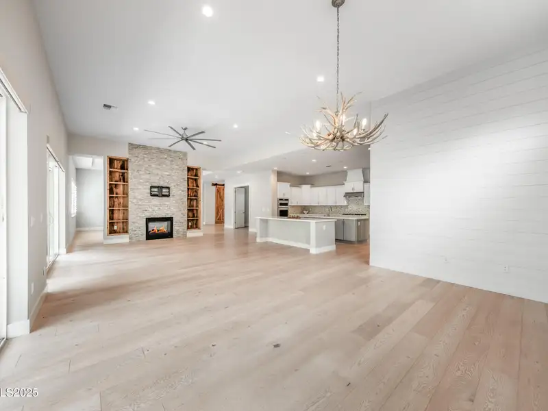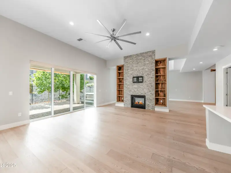 The adjoining great room centers around a striking stone fireplace framed by a custom wood bookcase and mantle, creating a cozy yet refined focal point. Large windows and sliding doors connect the indoors with the outdoors, making the space bright and versatile.