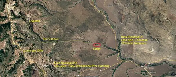 UBICACIÓN:Situada en la Patagonia Argentina, provincia de Neuquén, a 2.30 hs del Aeropuerto Internacional de Neuquén, a 75 km de la ciudad de Zapala, a 20 km de la ciudad de Las Lajas y 15 minutos de la ruta 21 asfaltada. Se accede por un camino de tierra hasta el puente de la propiedad. También se accede por vía aérea mediante helicóptero.