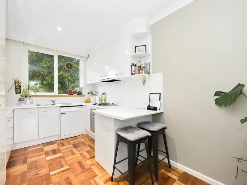 Every window frames a leafy outlook, giving the interior a sense of soul-soothing serenity. The living and dining area is open and inviting, enhanced by a picture window and access to a balcony nestled among the trees. The refurbished kitchen showcases crisp white cabinetry, gas cooking, dishwasher, under-bench oven and a breakfast bar for casual meals.