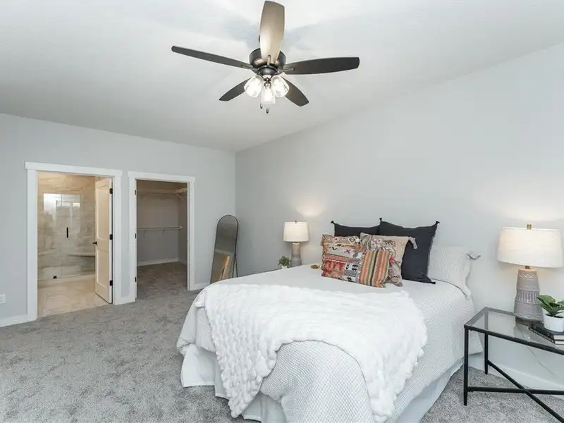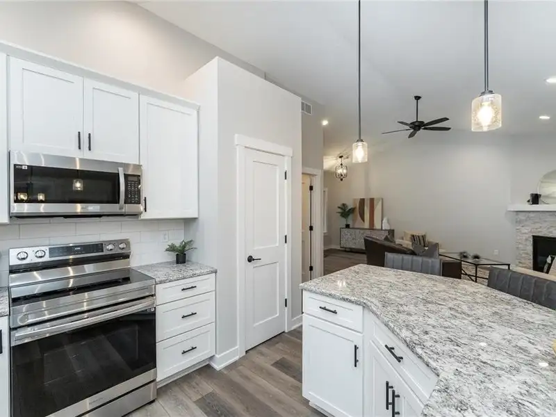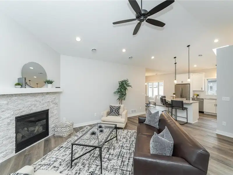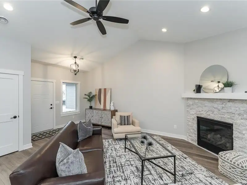 - Cozy corner fireplace in living area