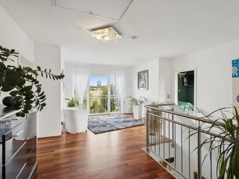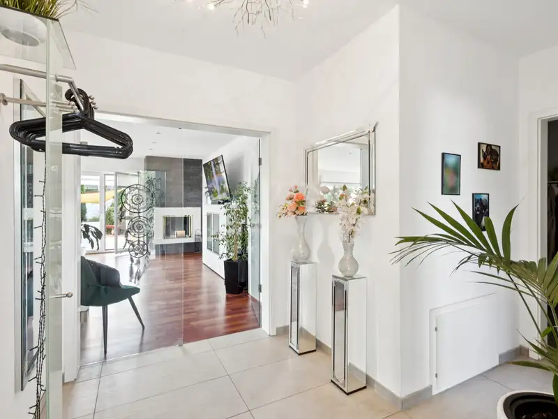 As soon as you enter the house, it is clear that the emphasis here is on spaciousness and brightness! The ceiling height of approx. 2.70 m in combination with many window and patio door elements, which allow access to the outside from every room on the first floor and flood the rooms with plenty of light, underline the spacious living ambience.
