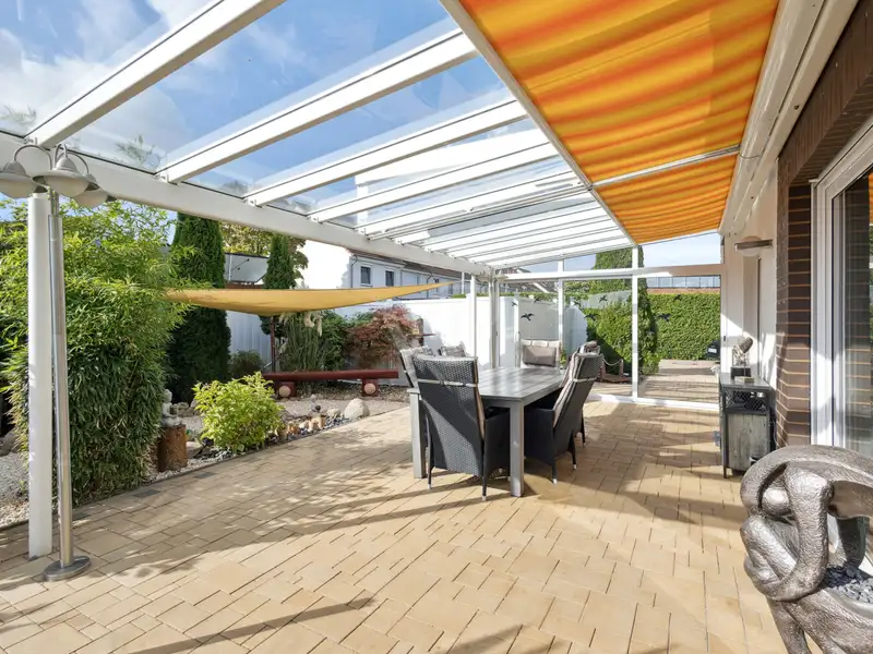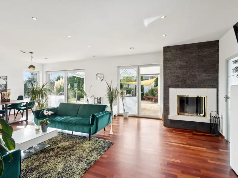 From the entrance to the house, a glass door gives you a first glimpse of the prestigious living area. This is divided into different living zones. The large dining table is located in the extension to the open-plan kitchen and the cozy couch corner can be placed near the fireplace. While the fireplace contributes to cozy hours in the living area in winter, you can enjoy your free time on one of the two terraces or on the balcony in summer. In addition to the patio cover, which protects one of the terraces from the rain, awnings also provide the desired shade.