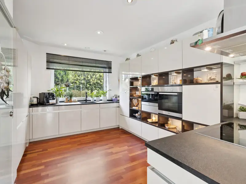The kitchen is equipped with every conceivable extra and will make the heart of any amateur chef beat faster. The white high-gloss fronts harmonize perfectly with the granite worktop and turn cooking into an event.