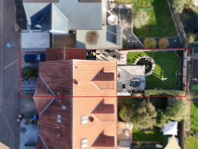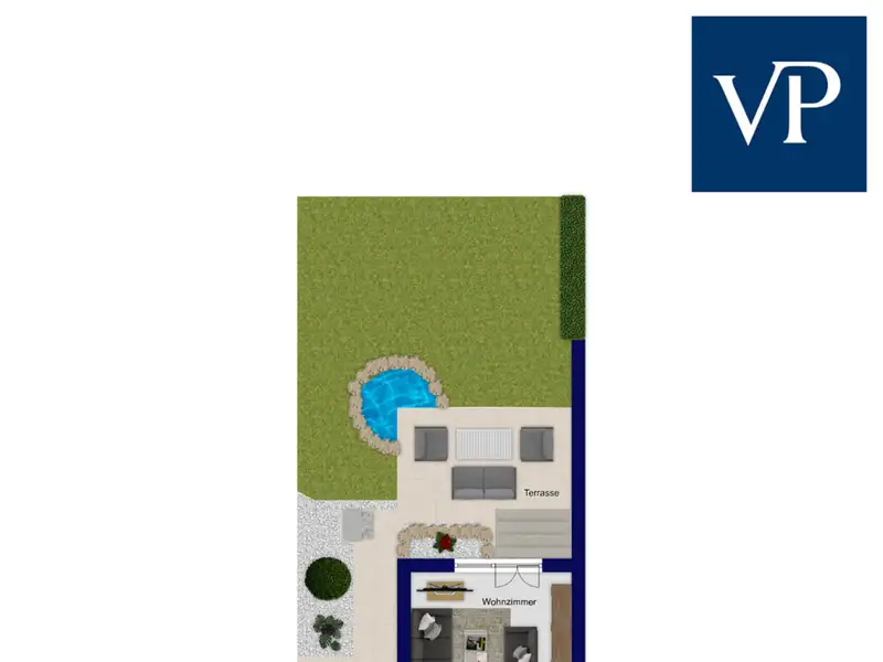 - Low-maintenance garden with terrace and pond