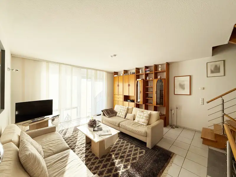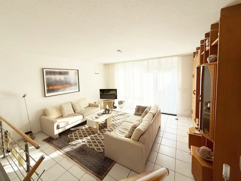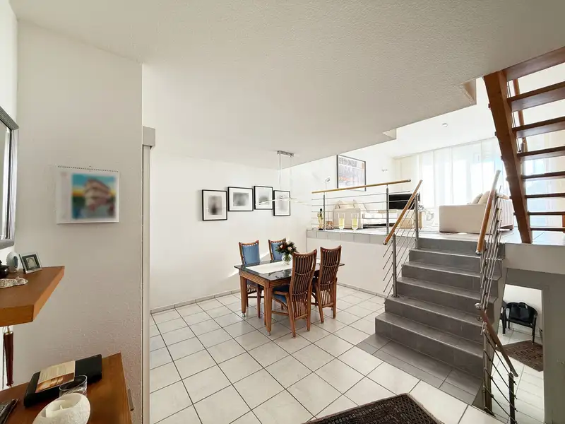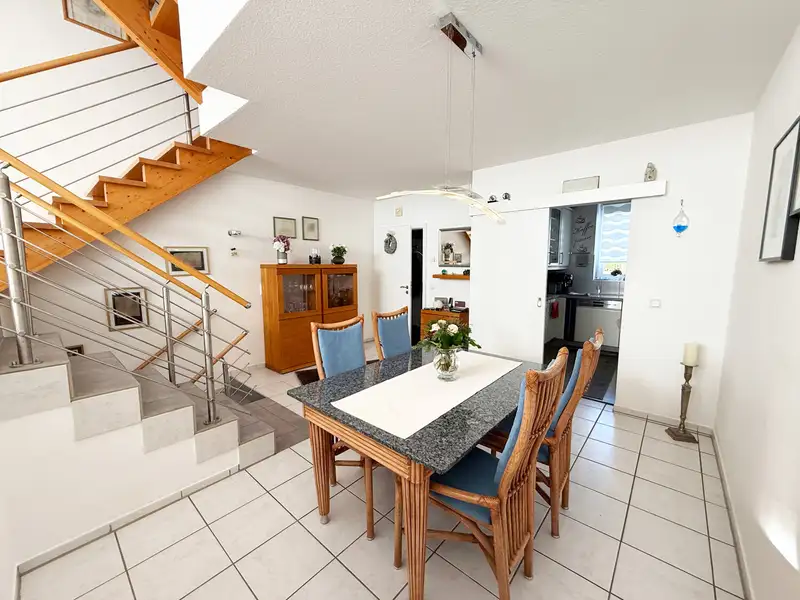- Split-level open living and dining area