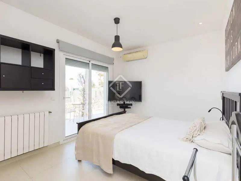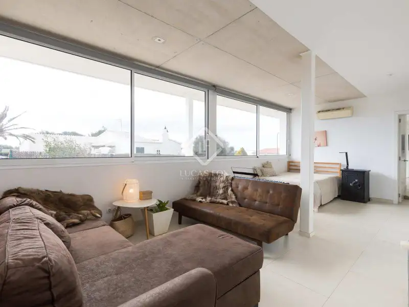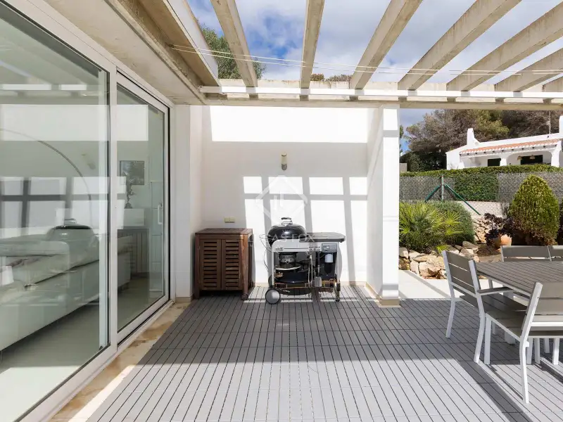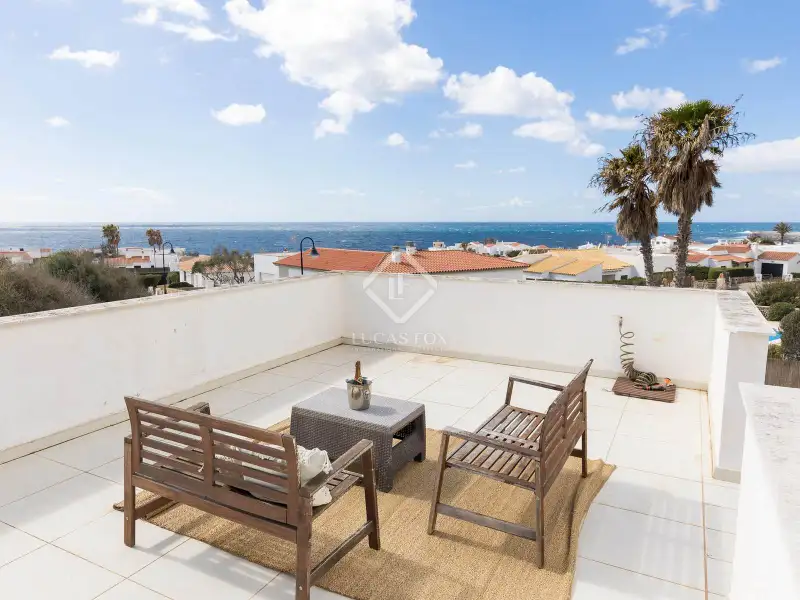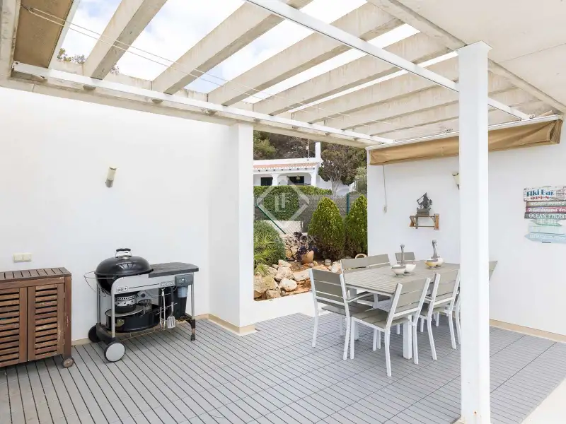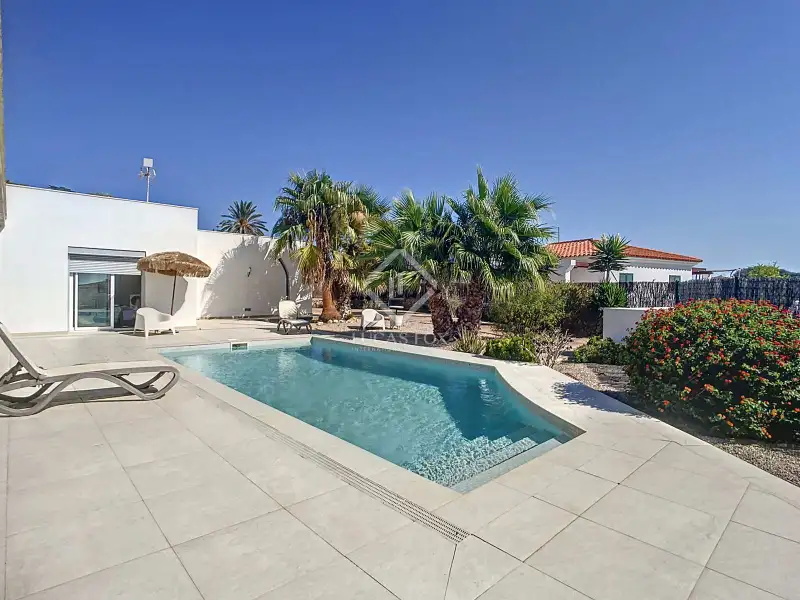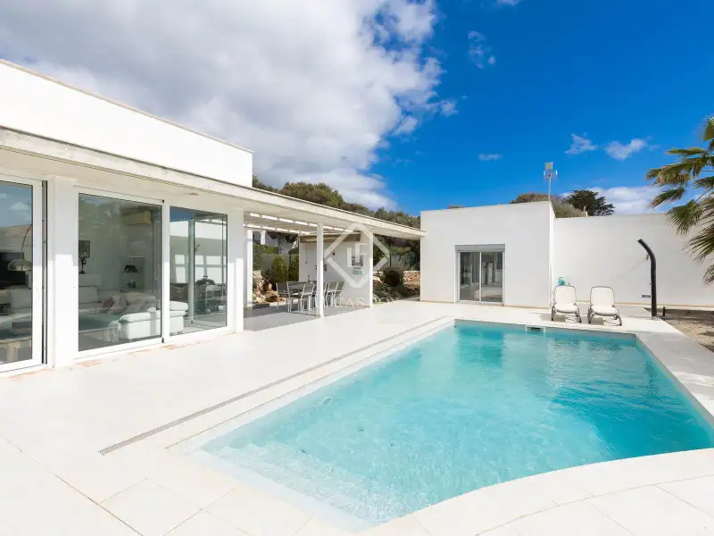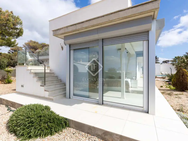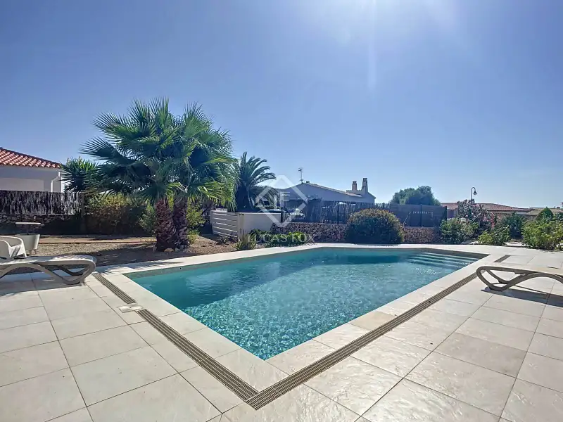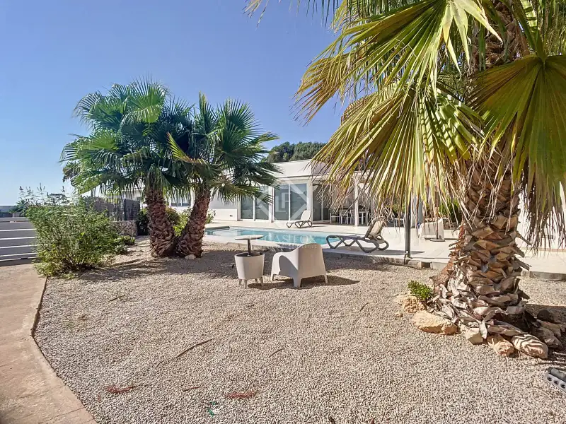Lucas Fox presents this villa with sea views of 256 m² built on a comfortable and spacious plot of 1145 m² in the south of the island of Menorca. This villa is characterized by its open and spacious spaces, as well as the luminosity provided by the large windows that surround the entire property and that facilitate entry and access to the garden area through any of its rooms. The property is distributed on a single ground floor. At the entrance, we find a living-dining room with access to a terrace covered by a retractable awning, open kitchen, utility room room, living room, a double bedroom with a private bathroom and two double bedrooms that share a bathroom. Through an exterior staircase, we reach the terrace with a solarium with spectacular views of the sea. The house has built-in wardrobes in all bedrooms, double-glazed windows, heating by radiators and hot-cold air conditioning by splits in all rooms. Exterior, we have an ideal annex as a guest house, where there is a double bedroom and a bathroom. In addition, in that same construction, we have a garage of about 36 m². The house is surrounded by a garden area with drip irrigation, tricolor stone, palm trees and varied vegetation. We have a terrace area where there is a porch between the main house, the annex and the pool area. A property near the sea, ideal to live all year round or spend the summer season with family and/or friends. Contact us for more information or to arrange a visit.