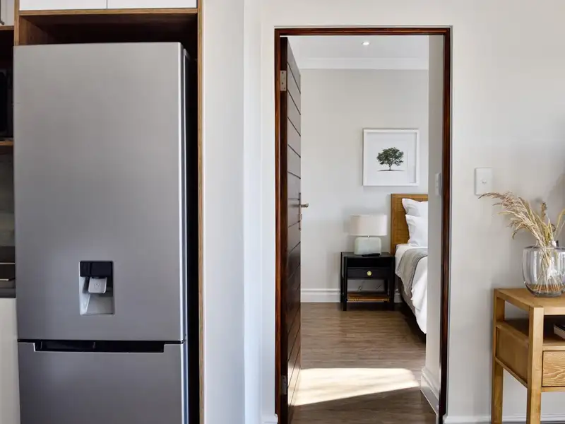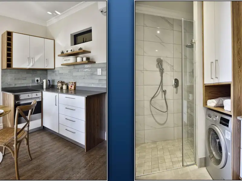 Inside, the unit is designed for effortless living. The kitchen is smartly laid out with a built-in dishwasher, microwave nook, and space for a full-sized fridge. Afternoon light fills the lounge and dining area, while the spacious bedroom flows into an en-suite bathroom with ample shower and washing machine space. Clever storage solutions make the most of every inch, including a built-in TV recess in the bedroom cupboard. Fibre is ready to connect, so youΓÇÖre never offline.