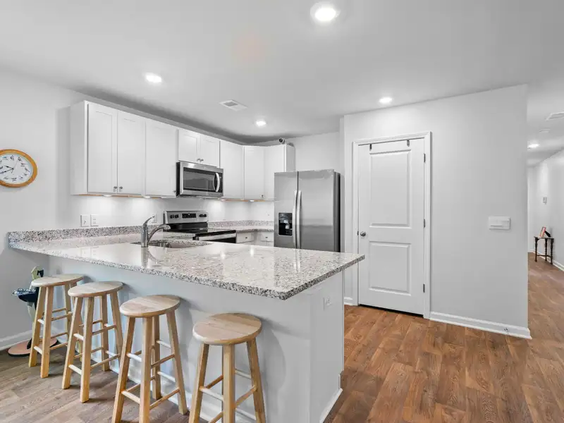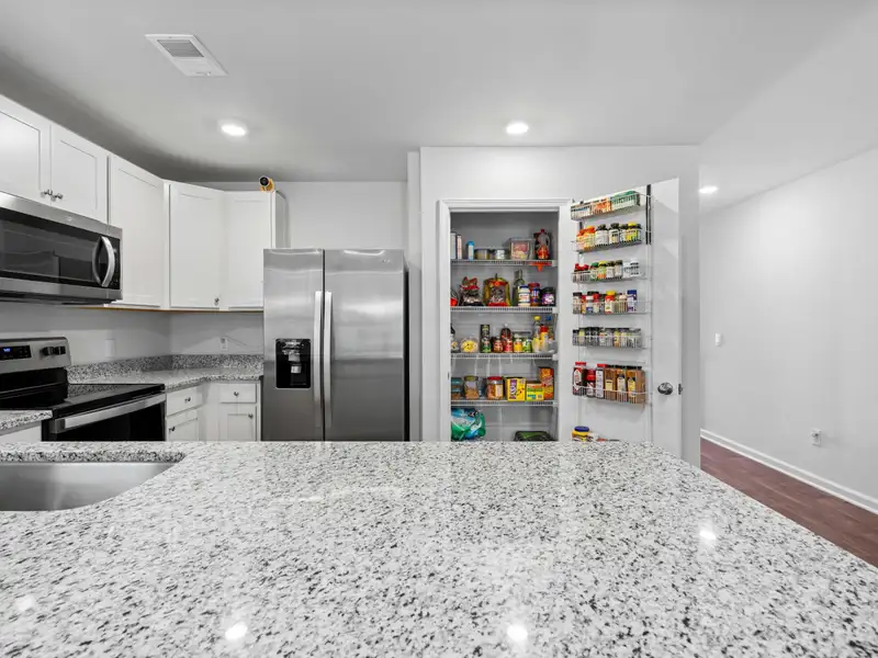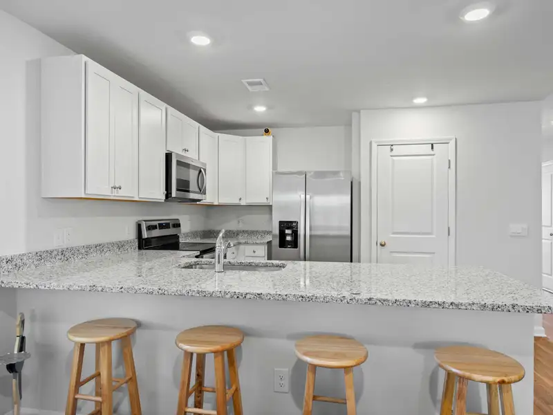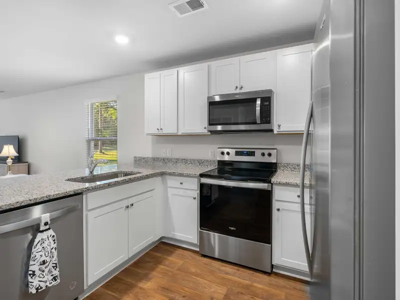 - Kitchen with granite counters and stainless appliances