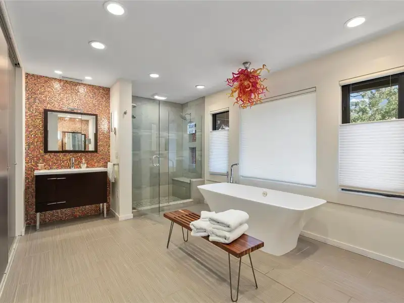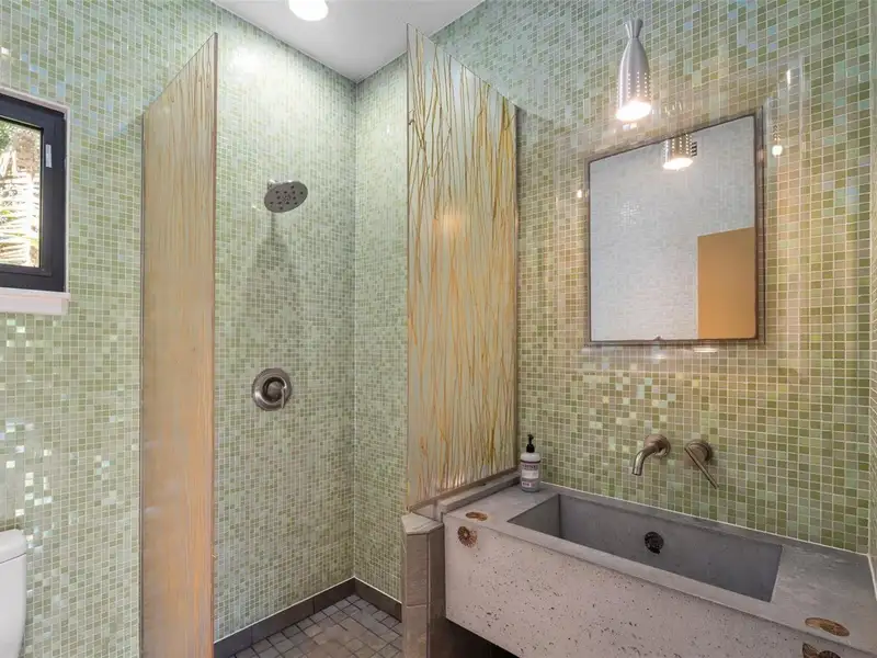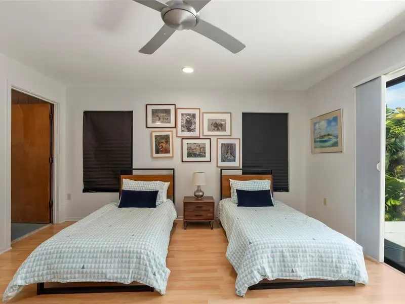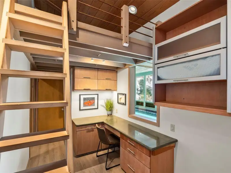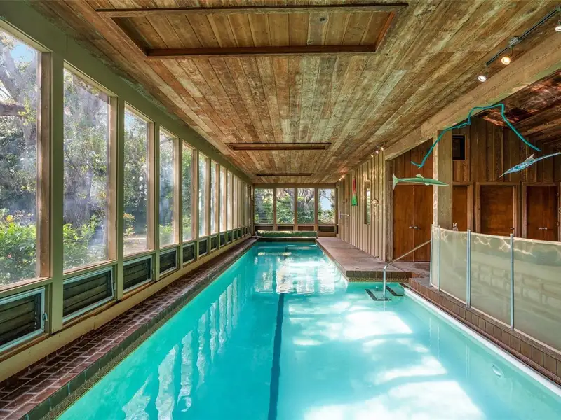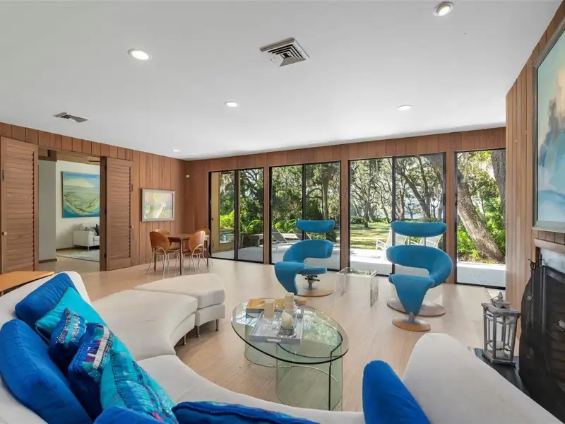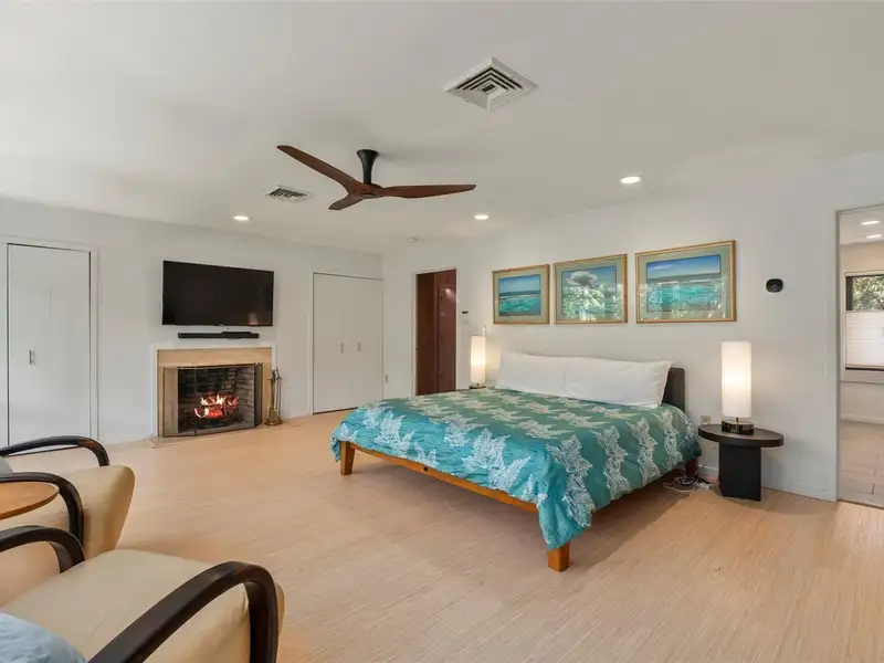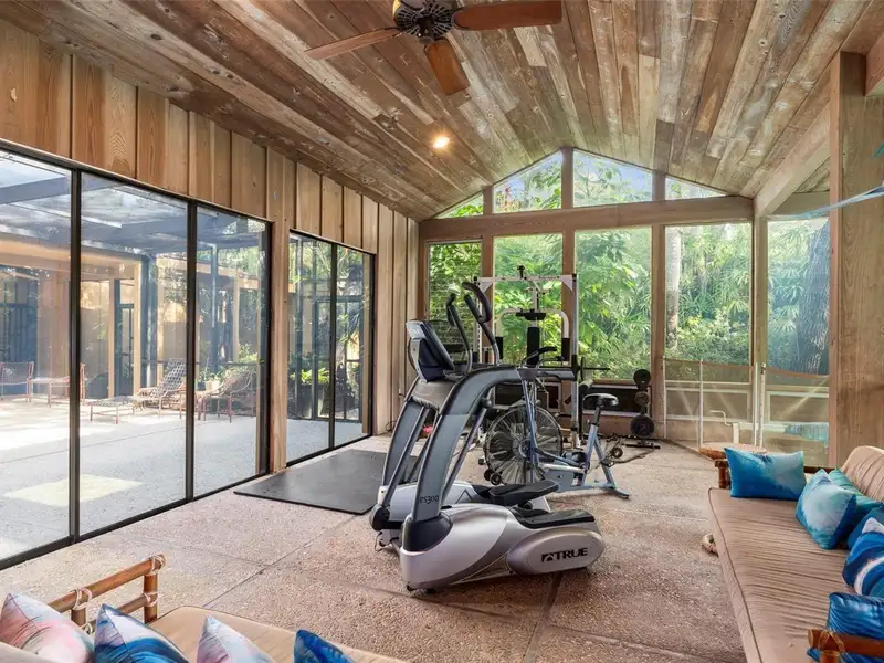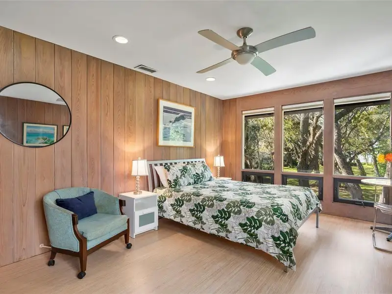 A Mid-Century Masterpiece Near the Beach & Village Discover this rare Mid-Century Modern gem, perfectly situated just moments from the beach and a short stroll to the shops and dining of Southside Village. Designed with timeless architecture and an enduring sense of style, this residence showcases dramatic cypress inside and out, blending warmth, character, and sophistication. Soaring ceilings and walls of glass bathe the interiors in natural light, creating a seamless connection to the lush surroundings. The expansive living room, anchored by a striking wood-burning fireplace, is both dramatic and inviting—an ideal setting for entertaining or quiet evenings at home. The open kitchen, designed for gathering, flows effortlessly to multiple outdoor patios and sitting areas. Upstairs, the private primary retreat offers a serene escape with its spacious bedroom, spa-inspired bath, and a dedicated laundry room for convenience. A second upstairs suite provides flexibility for family or guests. On the main level, an additional guest suite is complemented by a versatile bonus room—perfect as a home office, fitness space, or media room. Set on beautifully landscaped grounds with layered gardens and outdoor living areas, this home embodies the perfect balance of elegance and tranquility. Rarely does a property of such architectural significance and modern livability come to market.