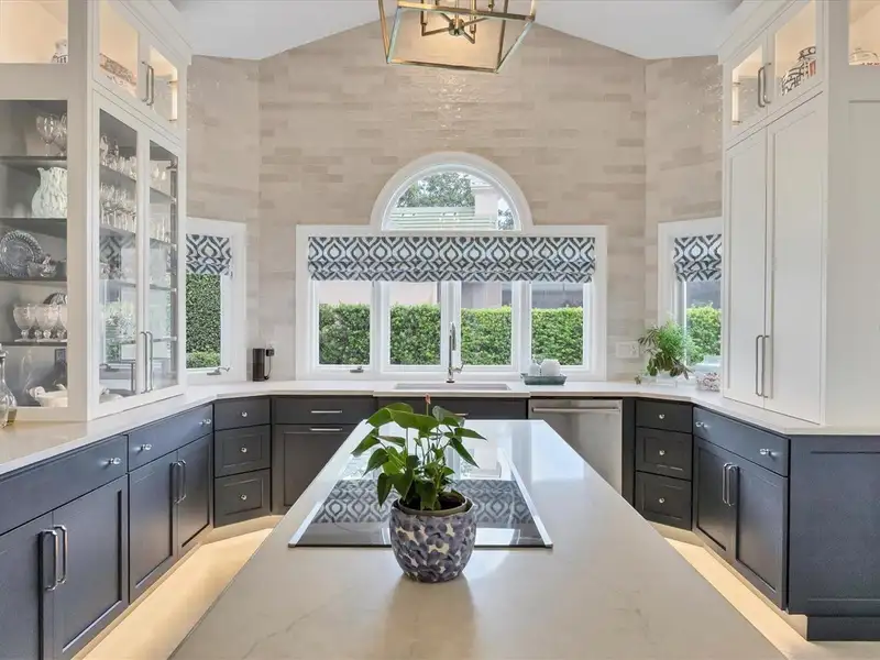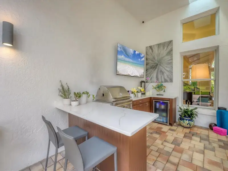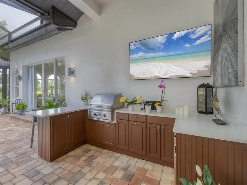 - Outdoor kitchen with built-in grill and cooler