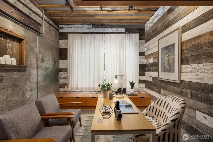 - Reclaimed wood and polished concrete floors