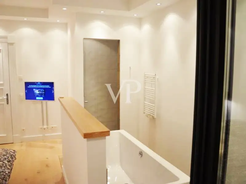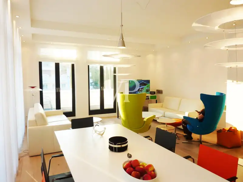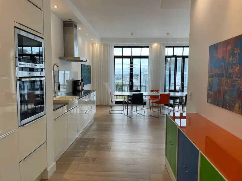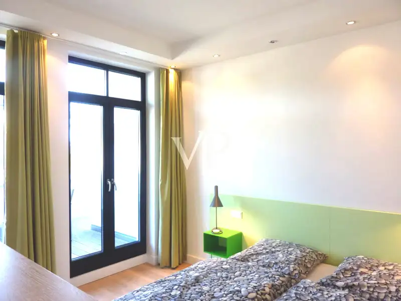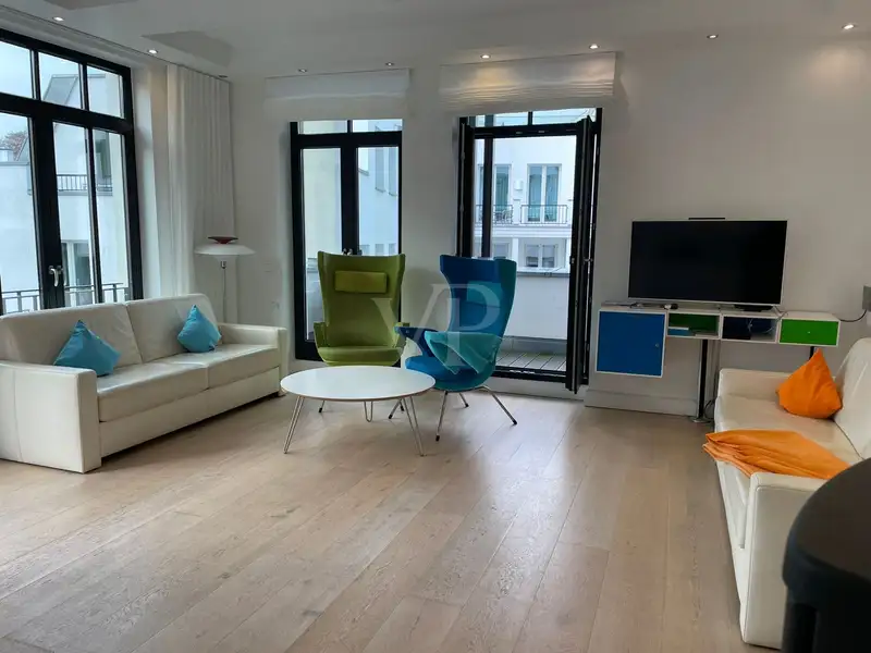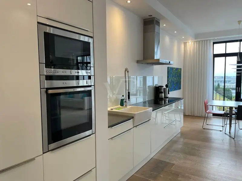 The exclusive apartment is completely furnished. The purchase price includes the fitted kitchen, cellar, an underground parking space as well as exclusive access to the indoor pool and SPA on the roof of the neighboring building.