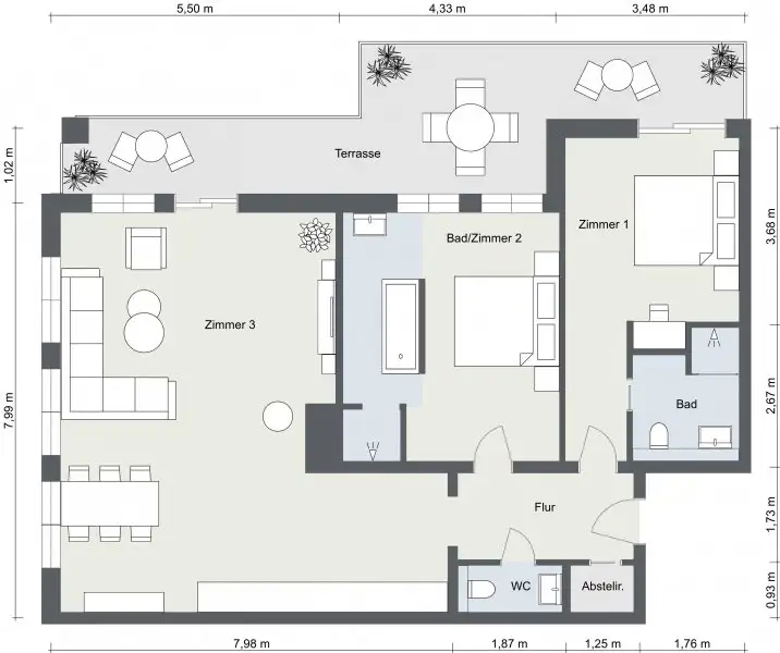 There are two bedrooms with attached en-suite bathrooms, including showers (floor-to-ceiling), free-standing bathtub in one of the bedrooms, designer washbasins, which are equipped with high-quality bathroom fittings, WCs as well as a guest WC. Special attention was paid to the architecture and equipment of the bathrooms during the planning.