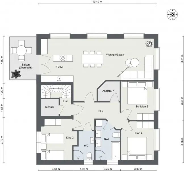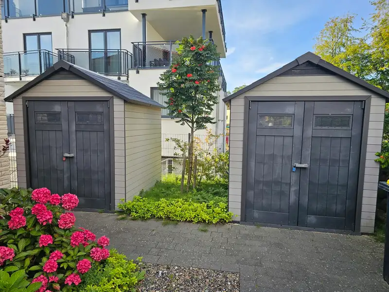 The outdoor area impresses with 2 separate fenced garden areas, ideal for cozy barbecues or sunbathing. There are also a total of 5 parking spaces and 3 bicycle sheds and tool sheds with electricity provide additional storage space.
