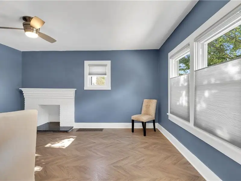 - Living room with large windows and fireplace