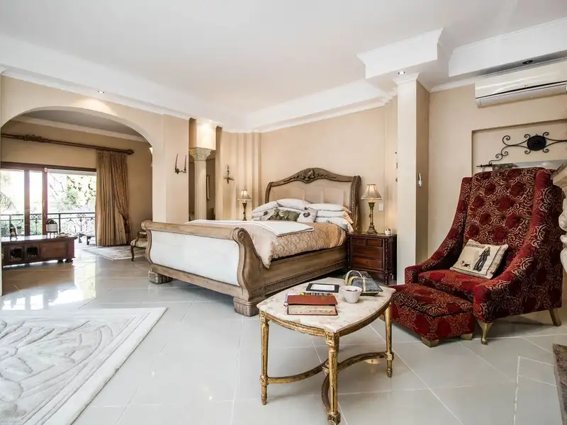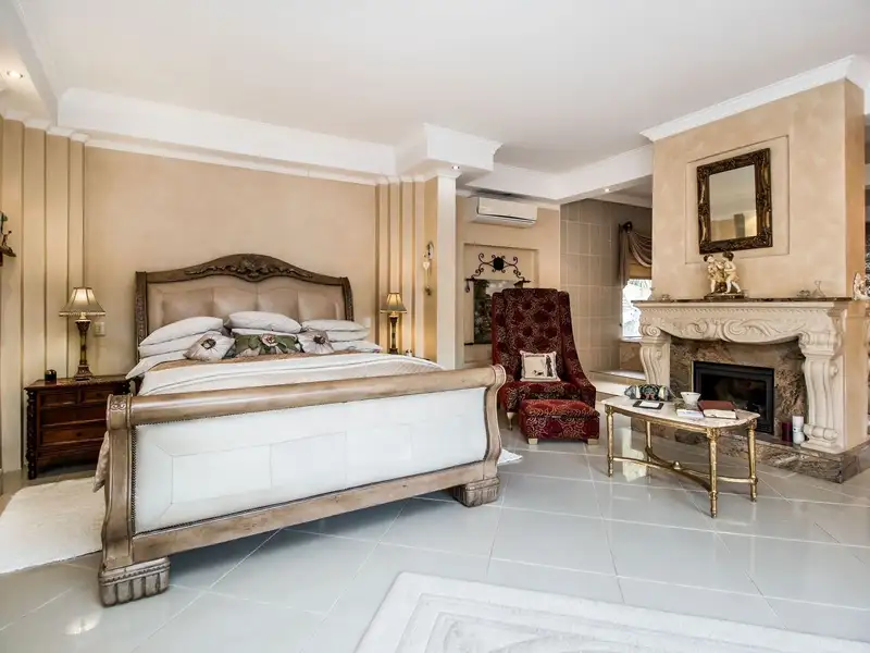Bedroom 6 (La Masquerade): The expansive main bedroom includes a large walk-through dressing room, TV room, large balcony, separate enclosed toilet with basin and bidet, open-plan shower, large bath, store room, double basins, underfloor heating, and a fireplace.