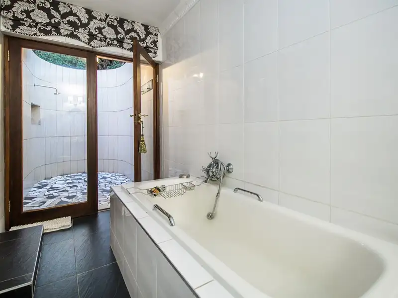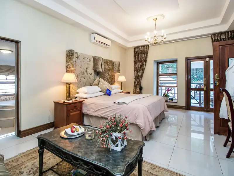 Bedroom 2 (La Charmant): Upstairs, this spacious bedroom features an enclosed ensuite with a corner bath, shower, heated towel rails, double basins, Romeo and Juliet balcony, and air-conditioning.