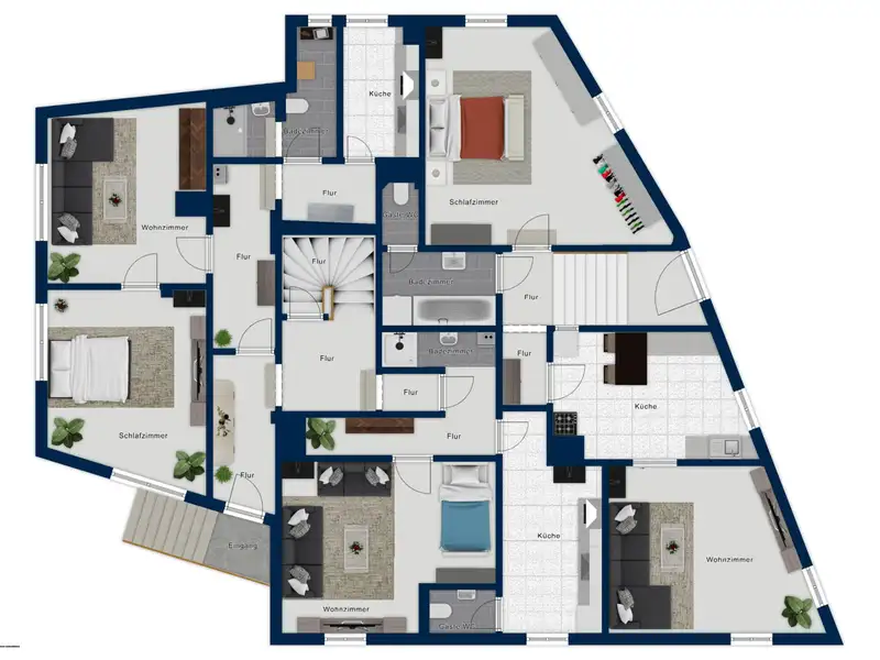 The adjoining staircase leads to the second floor, where there are two further residential units. To the right of the staircase is a two-room apartment with around 45 square meters. To the left of the stairwell is a three-and-a-half-room apartment with around 80 square meters of living space and an additional 48 square meter roof terrace.