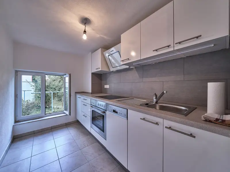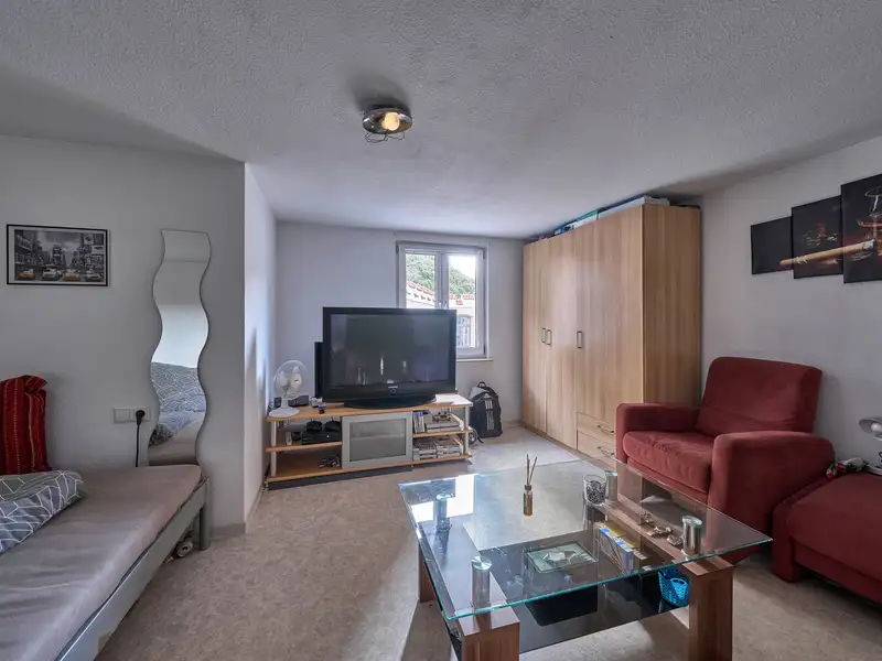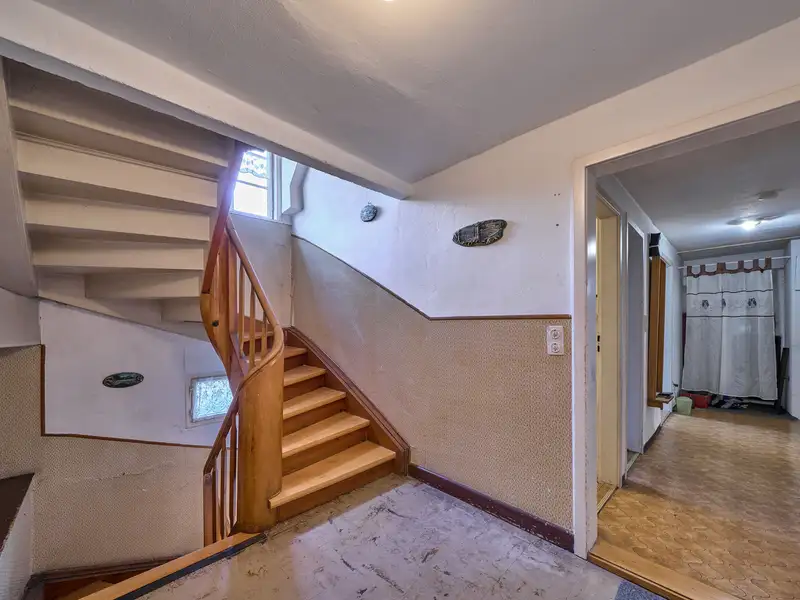 One residential unit with around 52 square meters and two rooms is accessed via a separate side entrance, while the others are reached via the entrance to the building and the adjoining hallway and staircase. Upon entering the building, the first apartment is located directly opposite the entrance. This is a newly renovated, currently vacant two-room apartment with a living space of around 50 square meters. Two small steps in the next hallway lead to the entrance of the second and smallest residential unit with one room and approximately 38 square meters of living space.