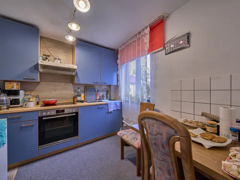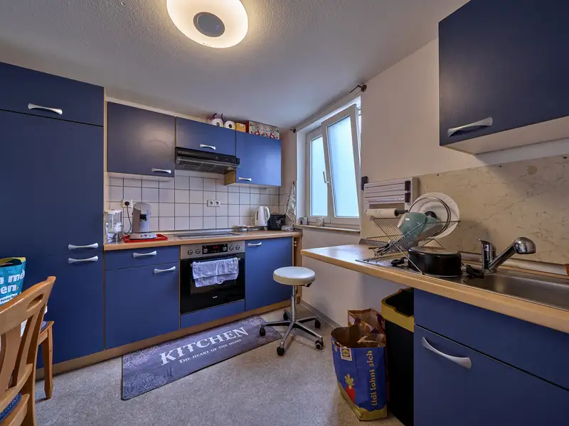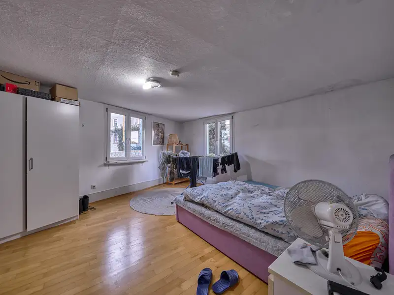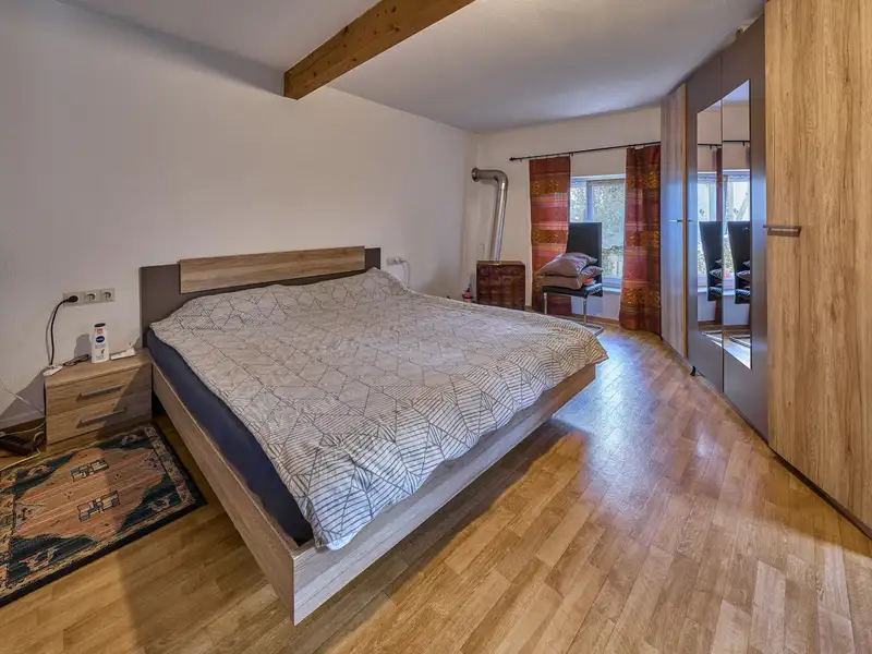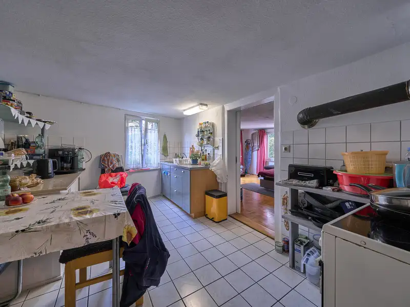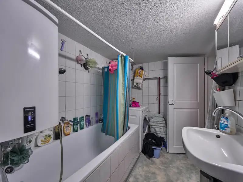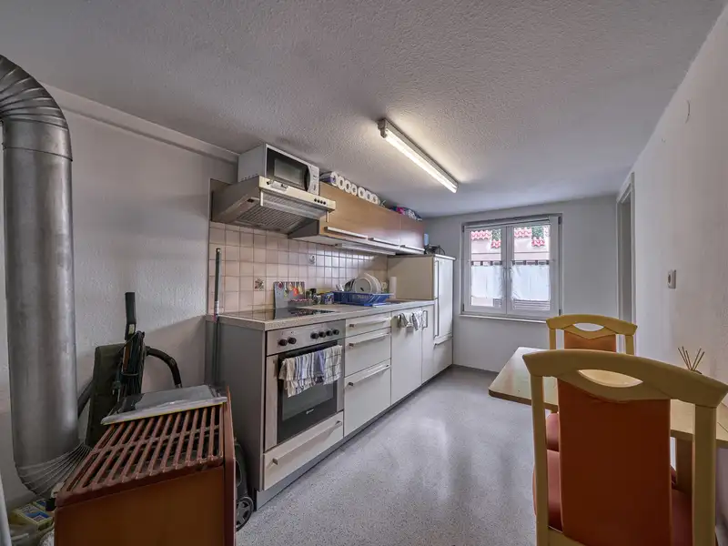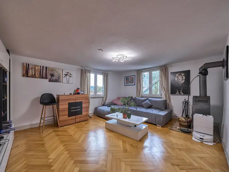The basement of the property can also be accessed via the hallway on the ground floor and an adjoining staircase. This is where, for example, the individual oil tanks for the individual oil stoves in the residential units, which are used to heat them, are located. The basement also offers compartments with usable space for the respective residential units. The three-and-a-half-room apartment also has a wood-burning stove for pleasant wood heat.