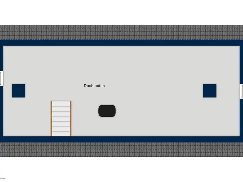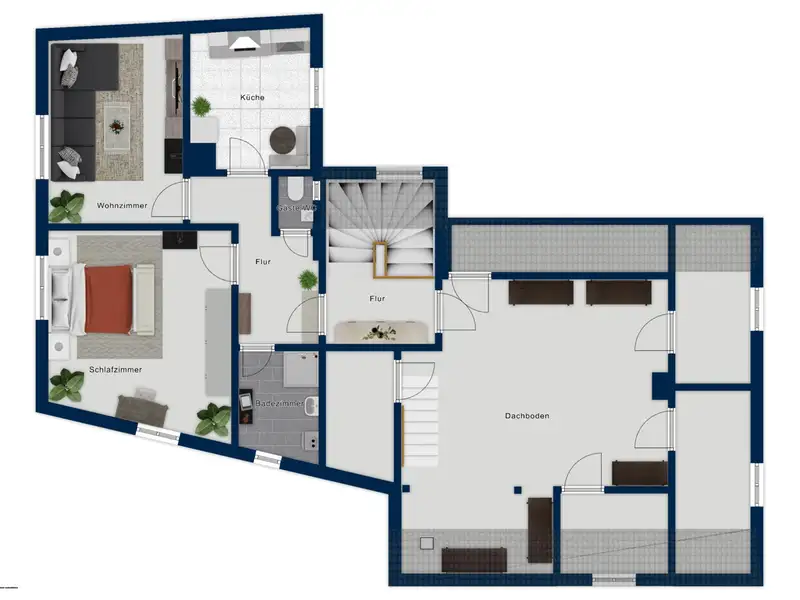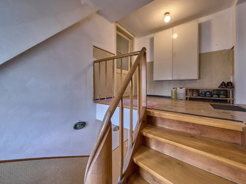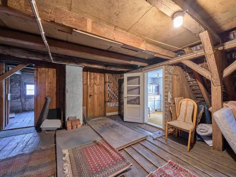 The staircase continues to the 2nd floor for the two-bedroom apartment in the extension with a living space of around 45 square meters, as well as to an unfinished attic and an unfinished attic in the old part of the building, which nevertheless provide space for a further apartment.