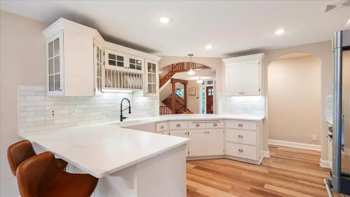- Kitchen with marble counters and custom cabinets
