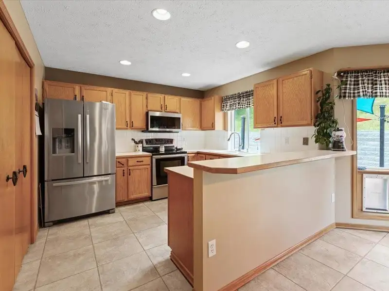 - Kitchen with stainless appliances, oak cabinets